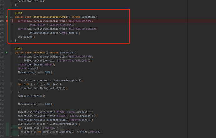 testQueueLocatedWithJndi,将作为source点传入参数。