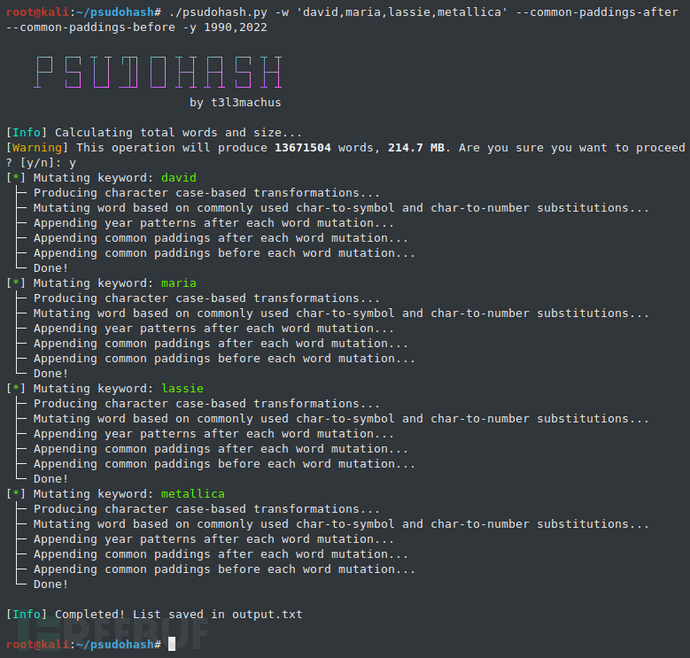 psudohash可以用于密码爆破任务中,以帮助广大研究人员测试密码的安全性。该工具能够模仿人类常用的某些密码创建模式,比如用符号或数字替换单词的字母、使用字符大小写变体、在单词前后添加常见填充等等。