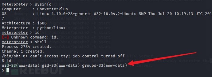 输入shell进行利用,再查看id,发现当前登录的只是一个普通用户,而不是root用户