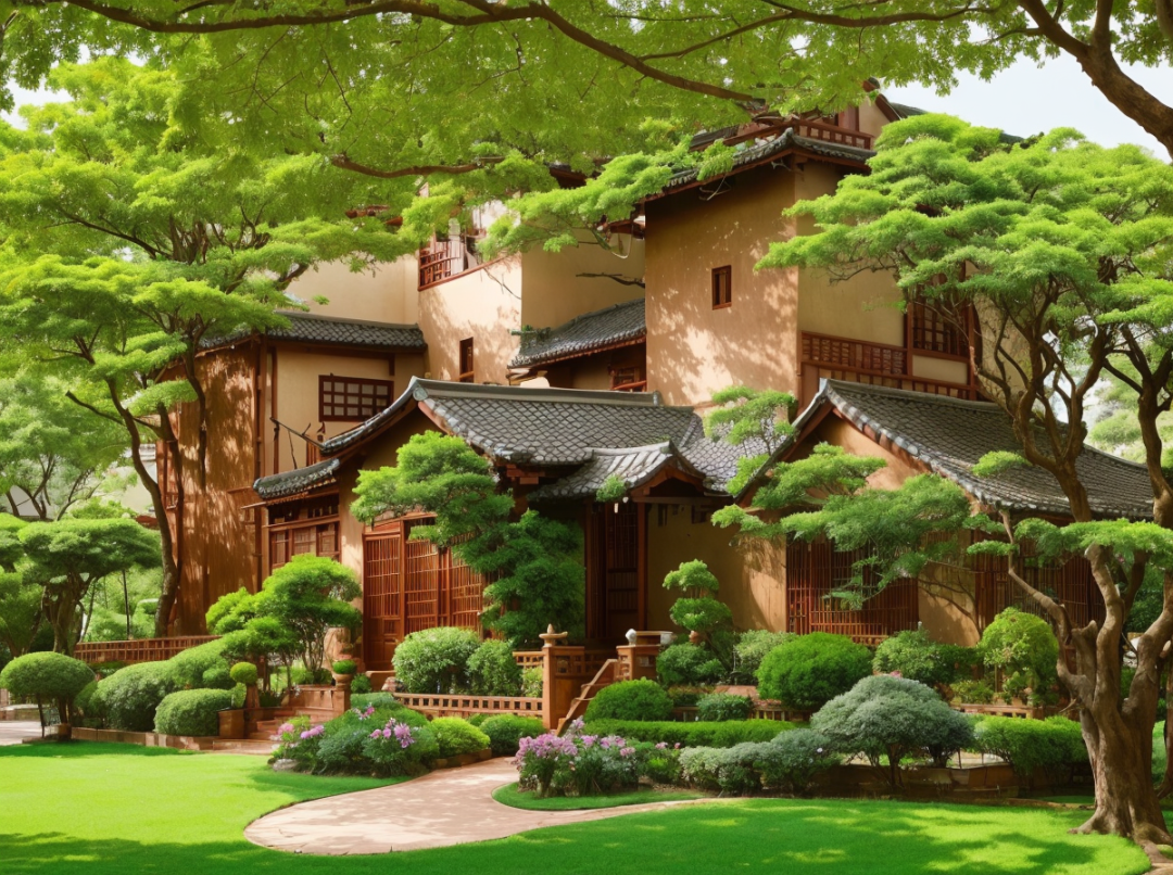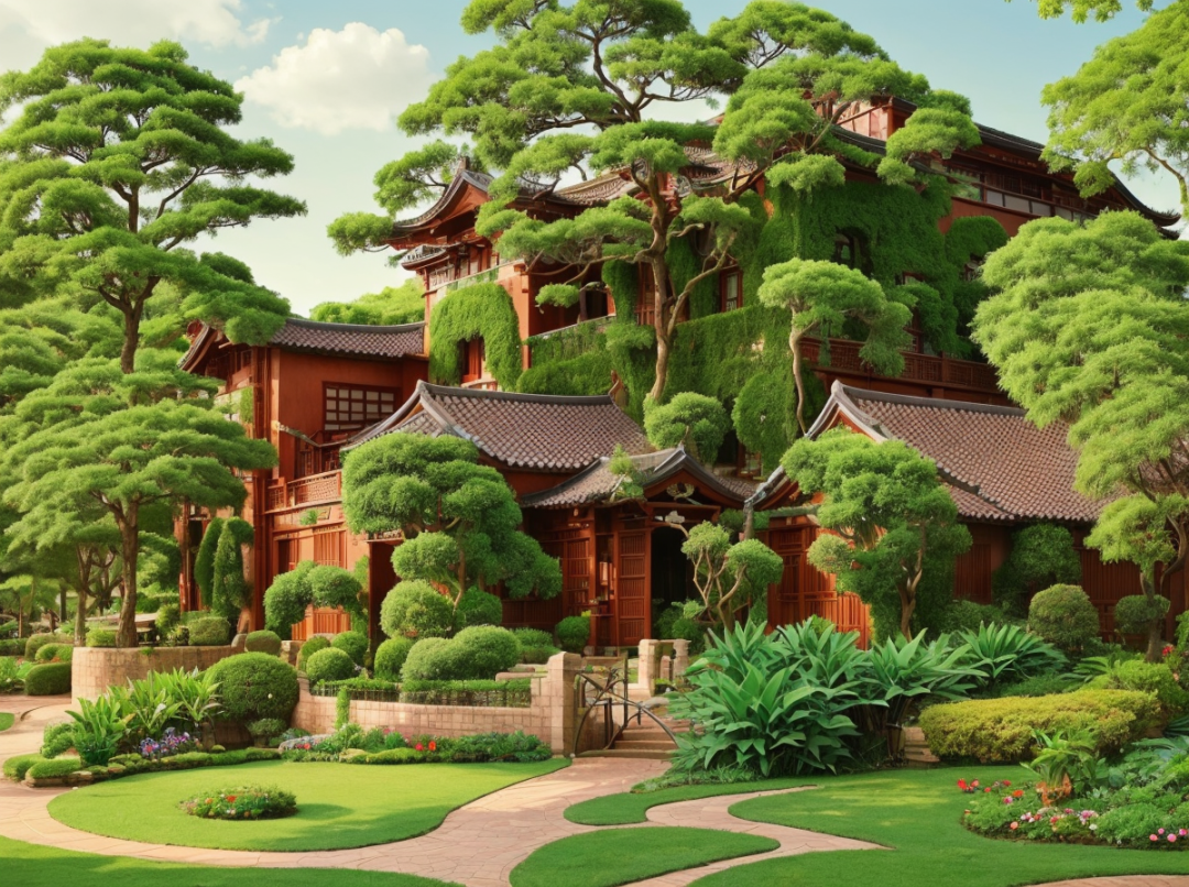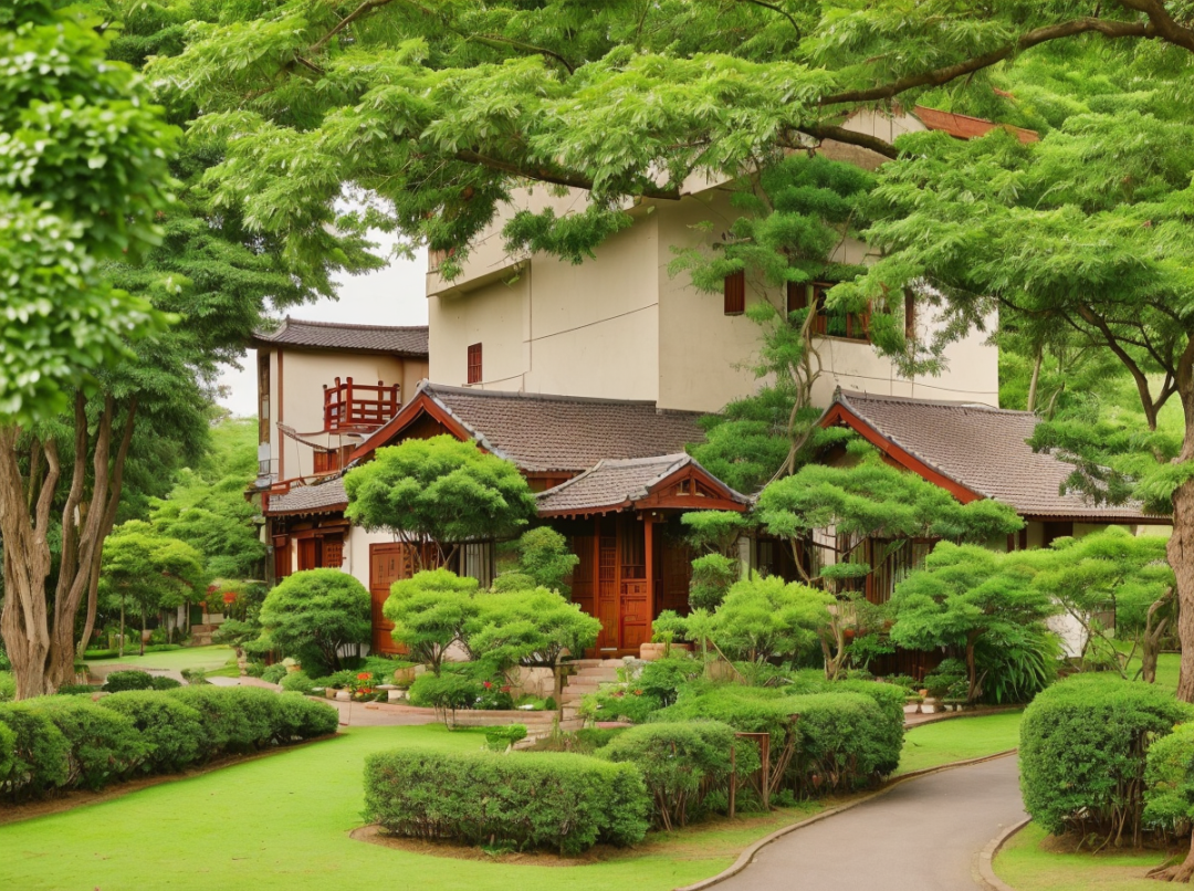 Oriental architectural design,townhouses,80's houses,lawns,green trees
