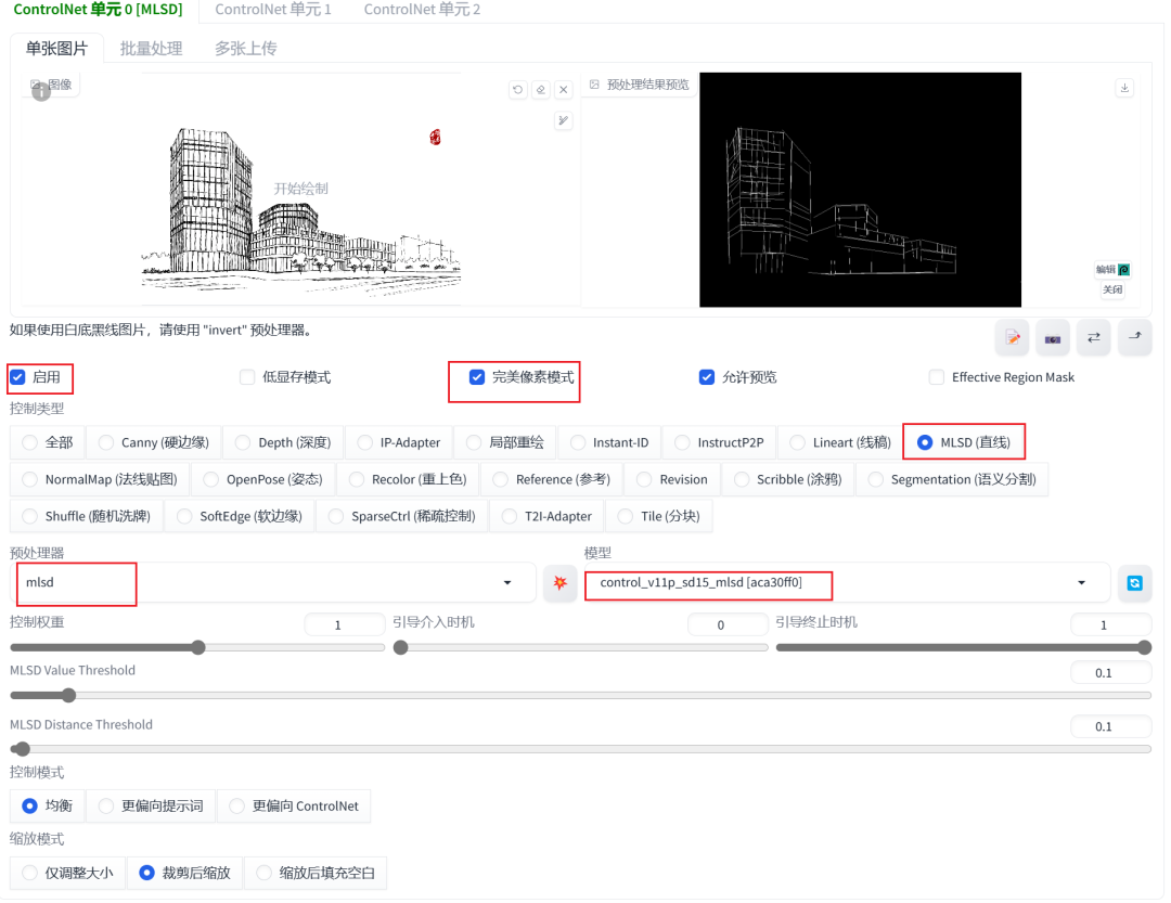 • 使用ControlNet类型为MLSD 。
