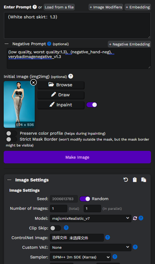 4.选择大模型,设置提示词。(本次使用的是majicMIX realistic写实模型)