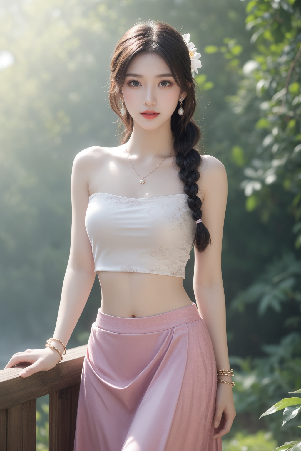 Prompt:1girl, jewelry, solo, bracelet, hair ornament, hair flower, braid, flower, earrings, long hair, necklace, navel, looking at viewer, breasts, strapless, skirt, outdoors, midriff, blurry, bare shoulders, brown hair, single braid, blurry background, tube top, medium breasts, parted lips, crop top, brown eyes, pink skirt, black hair