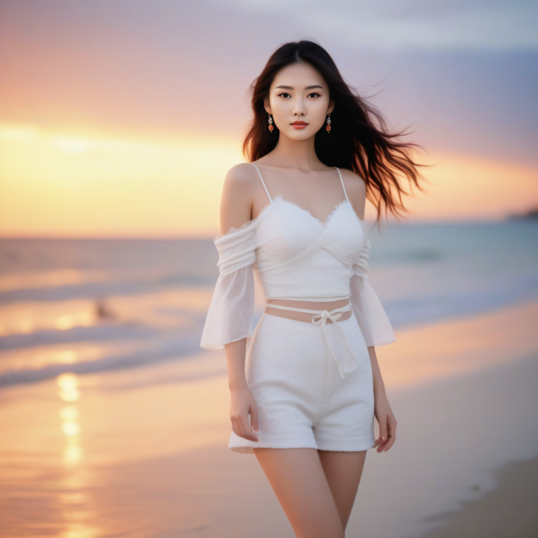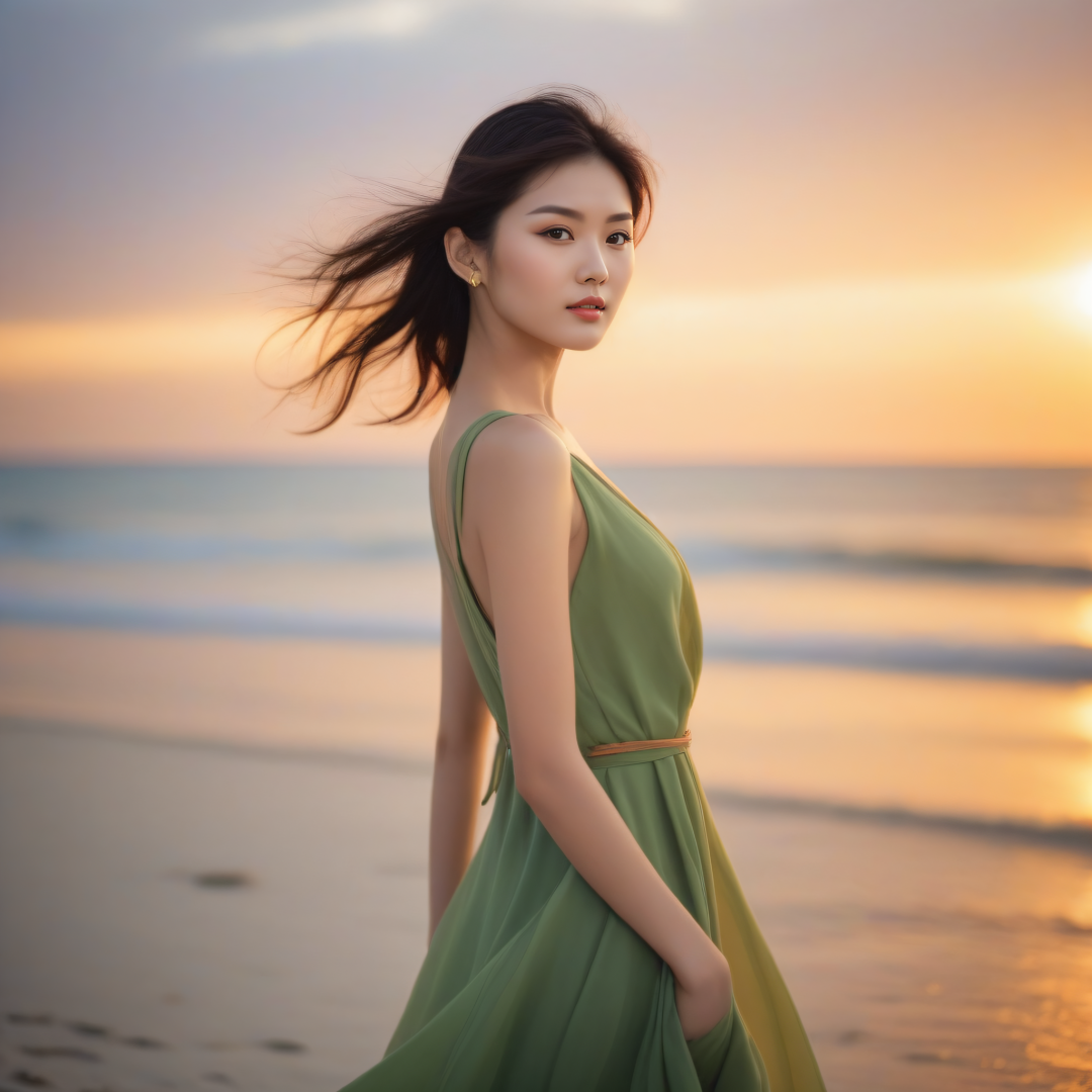 提示词: 一个美丽的中国超模,全身拍摄,日落背景,海滩,尼康N90相机拍摄,相机3/4视图