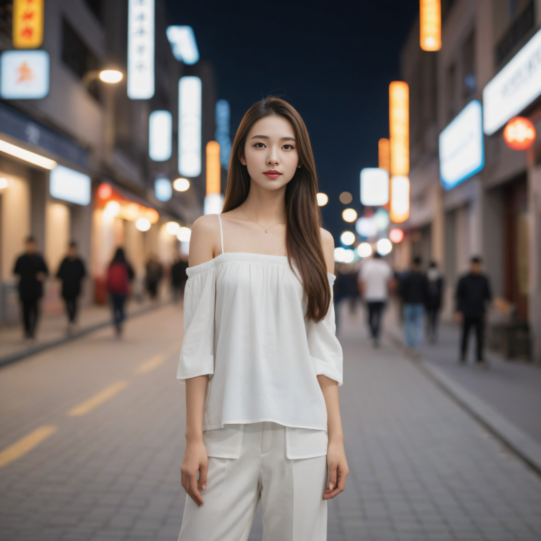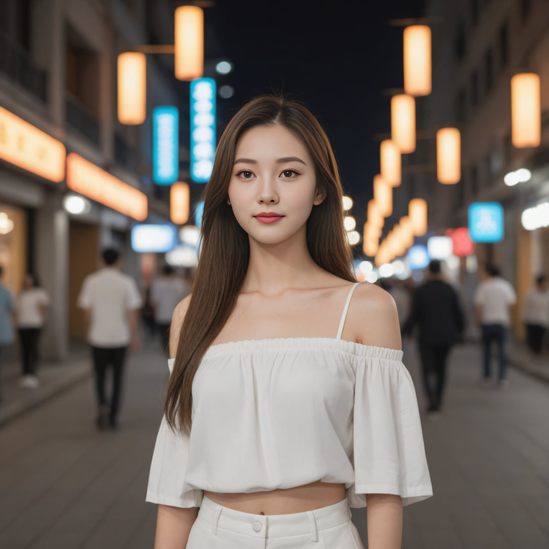 超级漂亮的中国女孩,独唱,长发,细致的眼睛,穿着白色适度的露肩上衣,看着观众,全身,夜景,城市背景,路灯,街拍,弱光条件,散景效果,暖色调,柔焦,