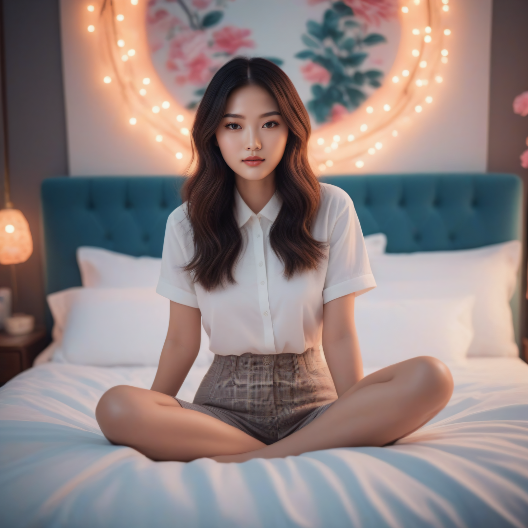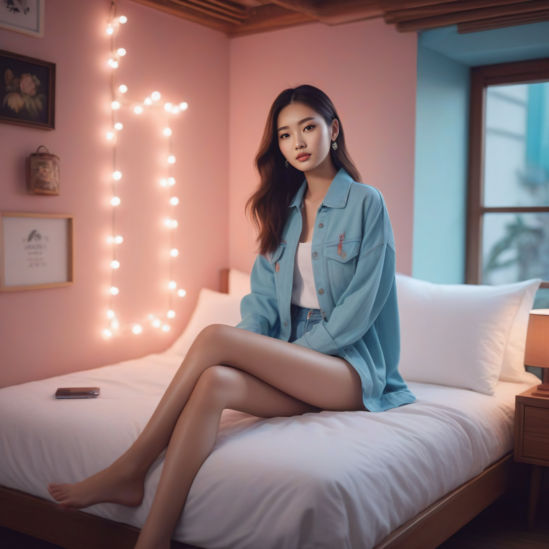 提示词:一个美丽的中国超模,坐,交叉腿床细节,边缘照明,(lofi,模拟)由布兰登·韦尔费尔