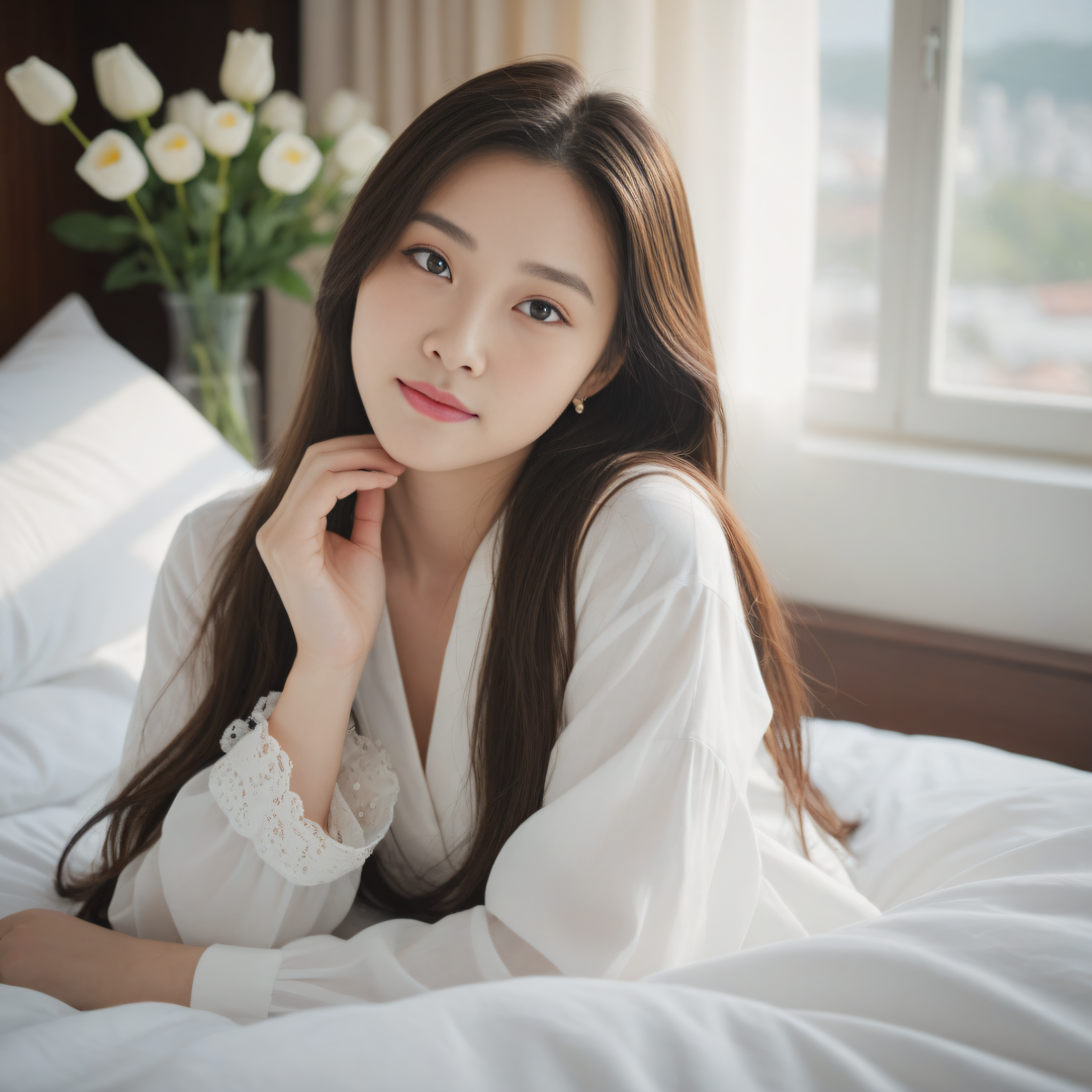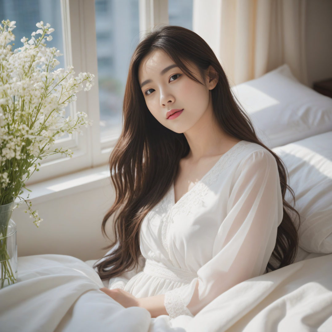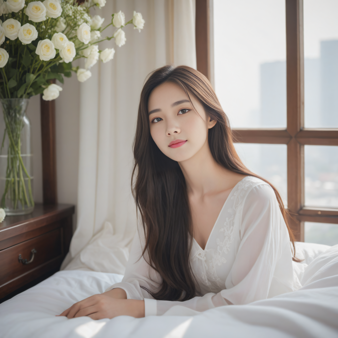 提示词: 1超级漂亮的中国女孩,长发,穿着白色的连衣裙,长发,躺在床上,阳光照在她的头发上,看着镜头,窗户上开满了花,