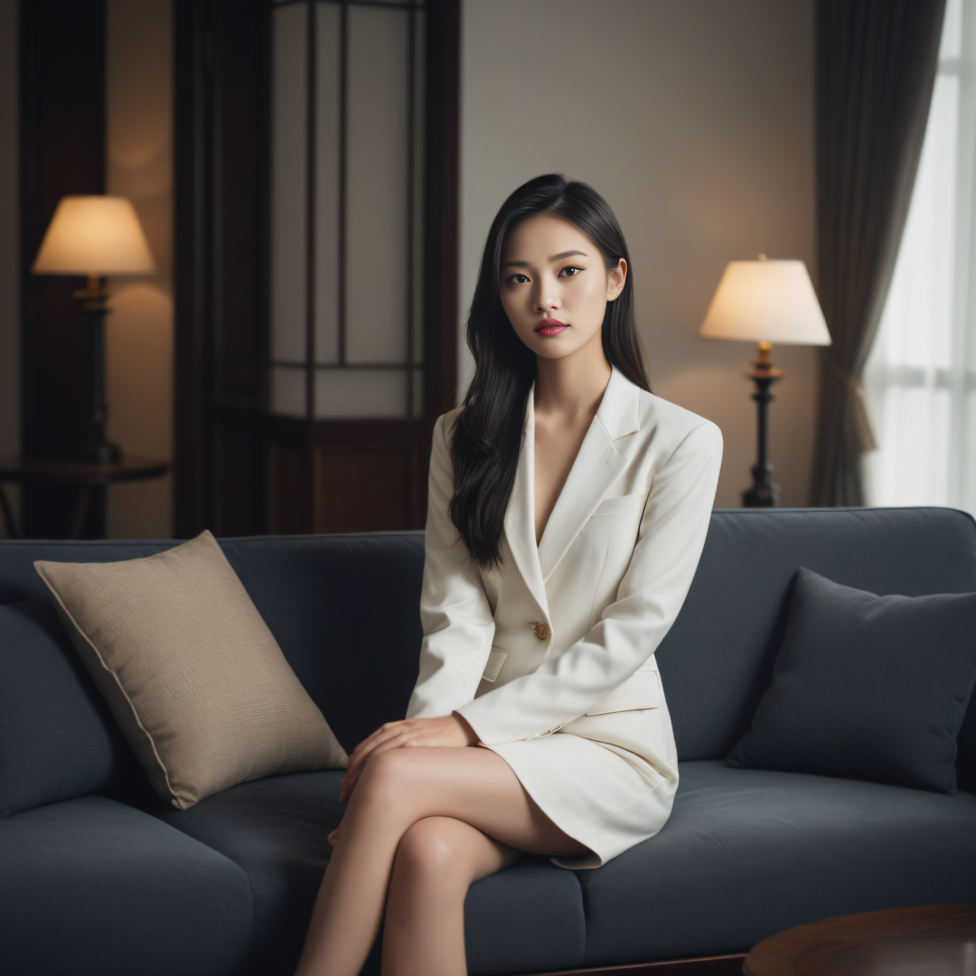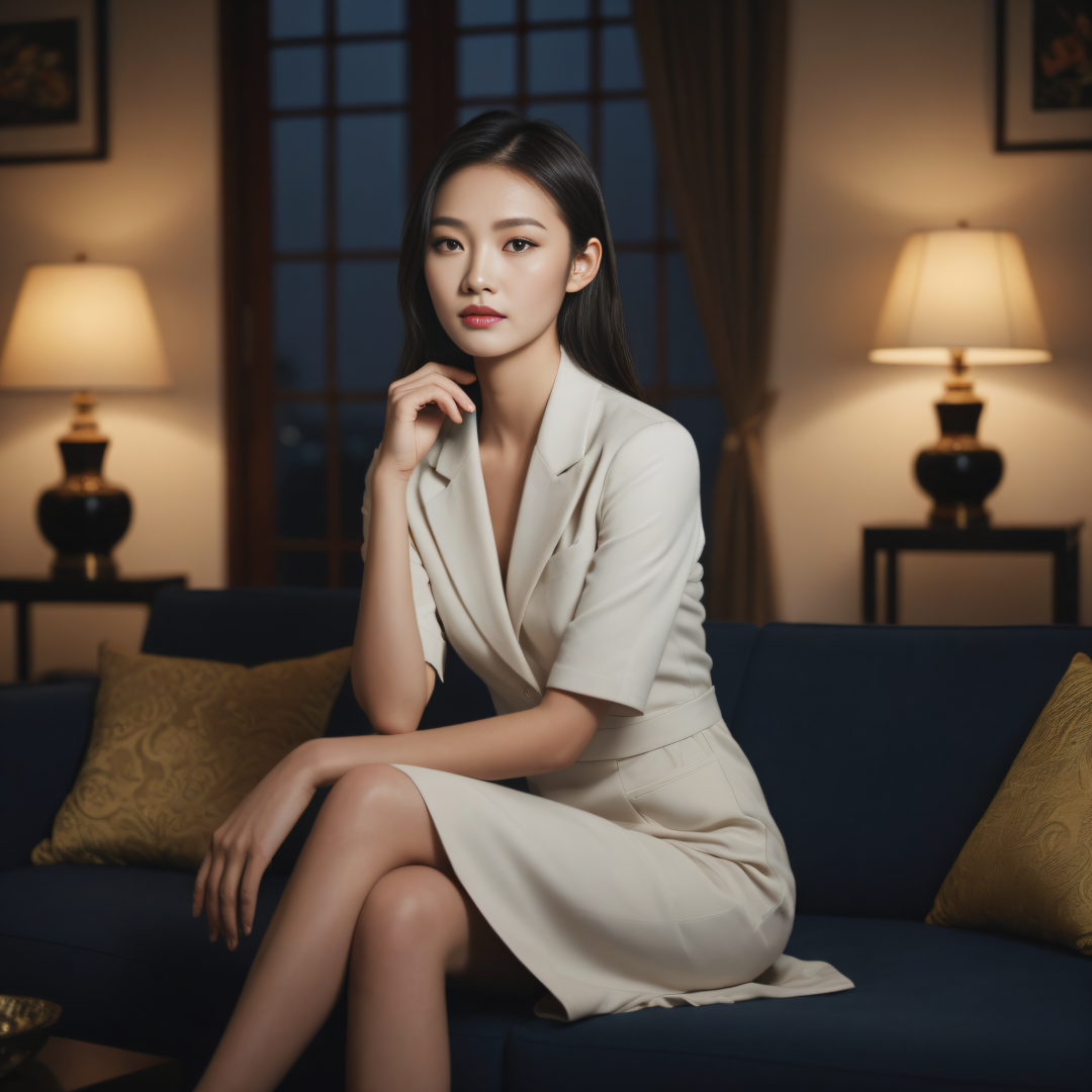 提示词:一个美丽的中国超模,坐在客厅的沙发上,戏剧性的灯光