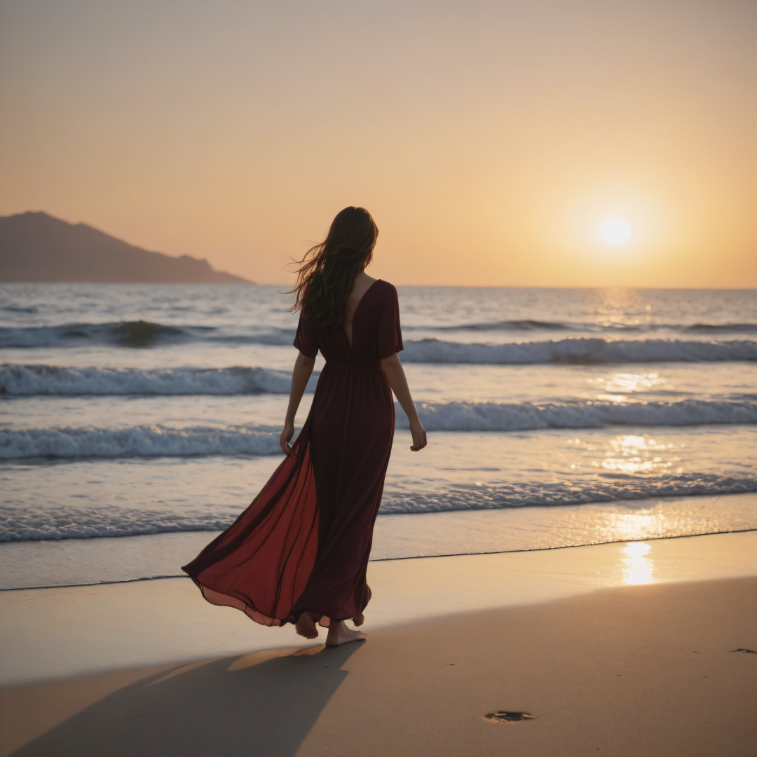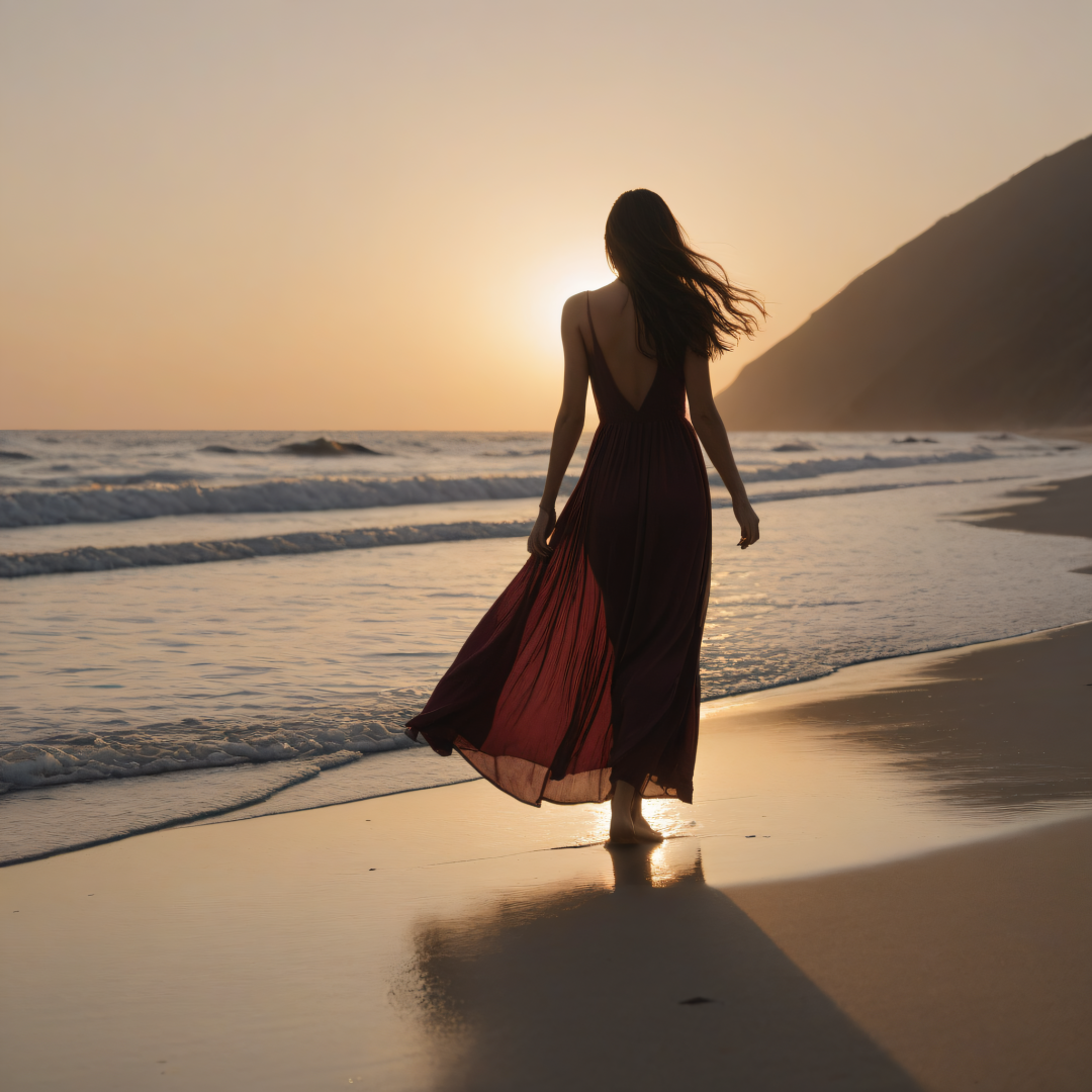Prompt: A silhouette of woman,long hair,wearing long dress,maroon dress,walking,barefoot,outdoor,beach,sand,waves,mountains,sunset,dusk,rear view,natural light,tranquil,serene,vacation,