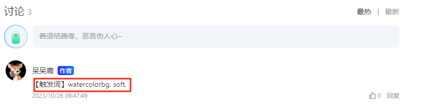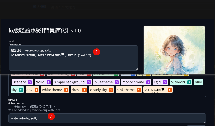 首先,将 触发词和注意事项,都添加到「描述」中,再把要用到的 触发词,写到「触发词」输入框中,选择使用时会自动添加: