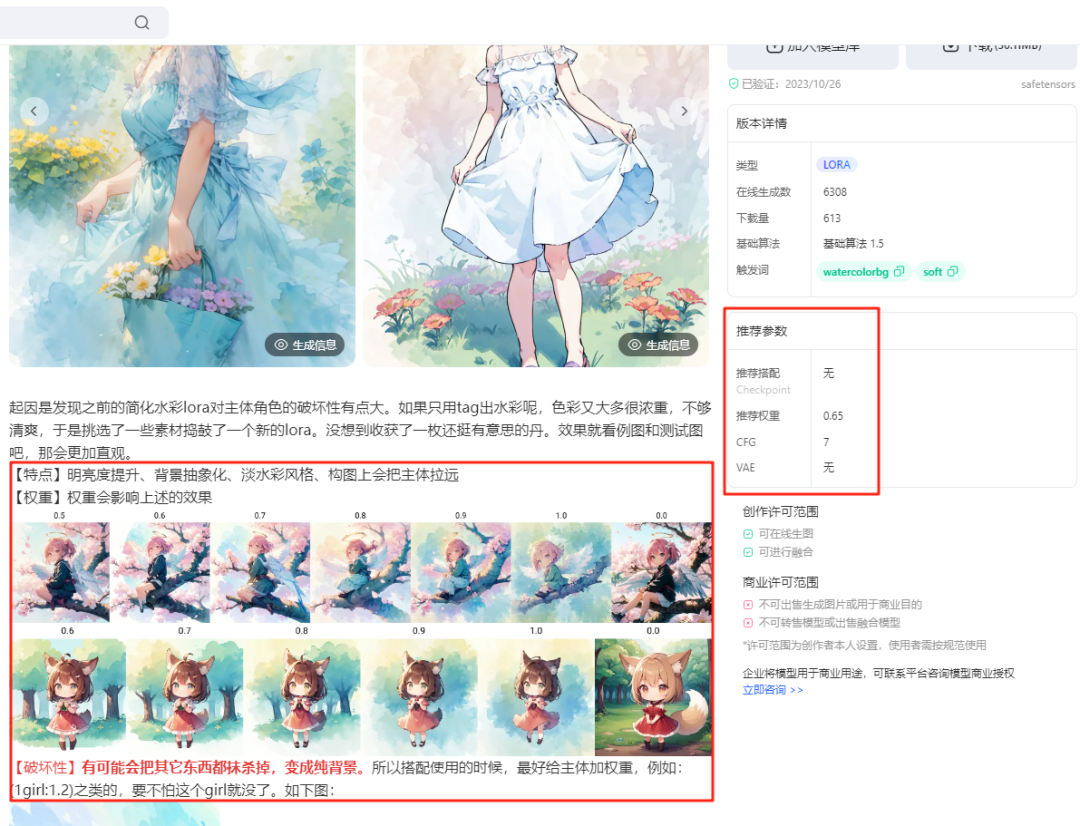 当看到一款心仪的 LoRA,除了下载下来以外,还需要关注详情页中,作者对模型使用的简介: