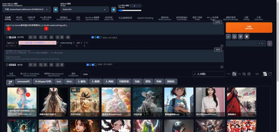 在正向提示词中,点击添加 LoRA,会自动把上一步填写的触发词填写进来;