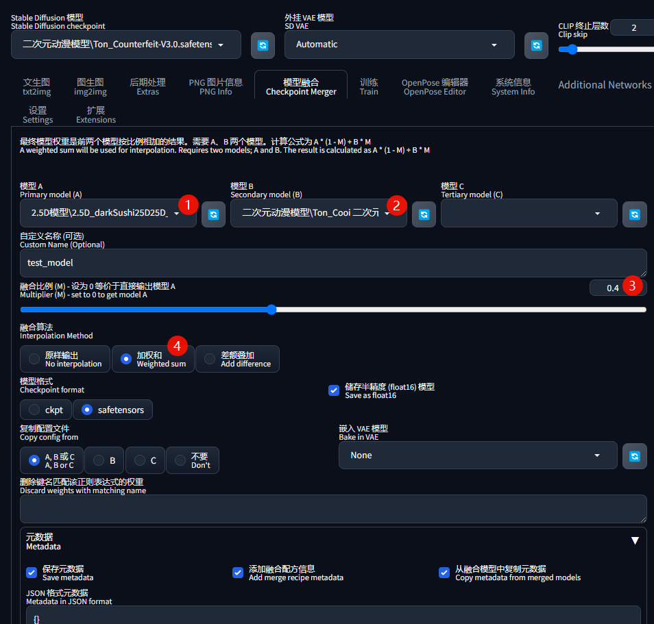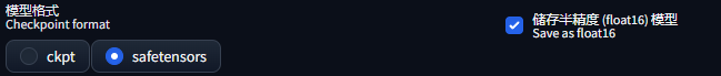 「模型格式」保持默认,对于显存比较小的电脑,勾选☑️「储存半精度模型」(模型融合容量会少一些,但清晰度细节会稍微损失一些):