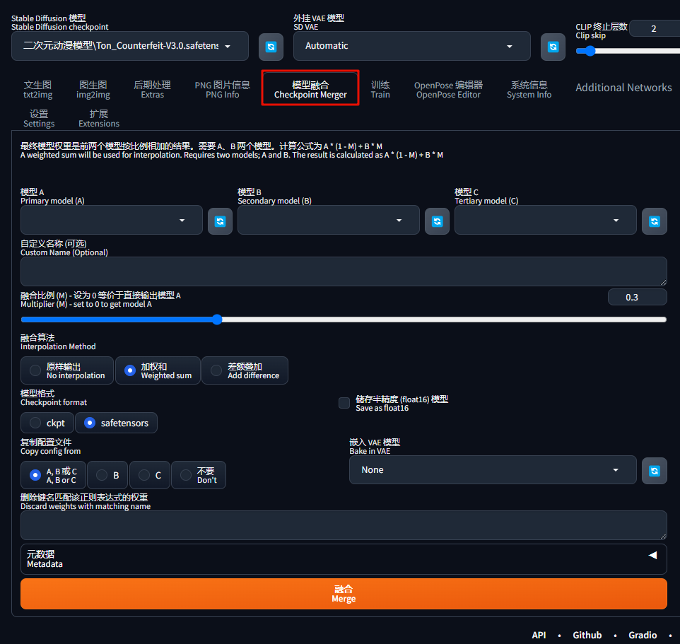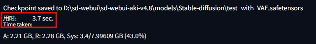 为了解决这个问题,我们可以使用 SD 自带额模型融合页面,手动给这个模型添加VAE文件: