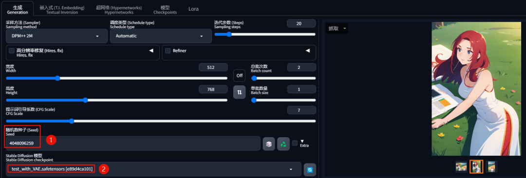 重新回到「文生图」页面,选择融合的模型,锁定种子,重新生成图片: