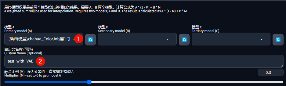 在「模型A」中添加缺少 VAE 文件的模型,并给模型起一个新的名字: