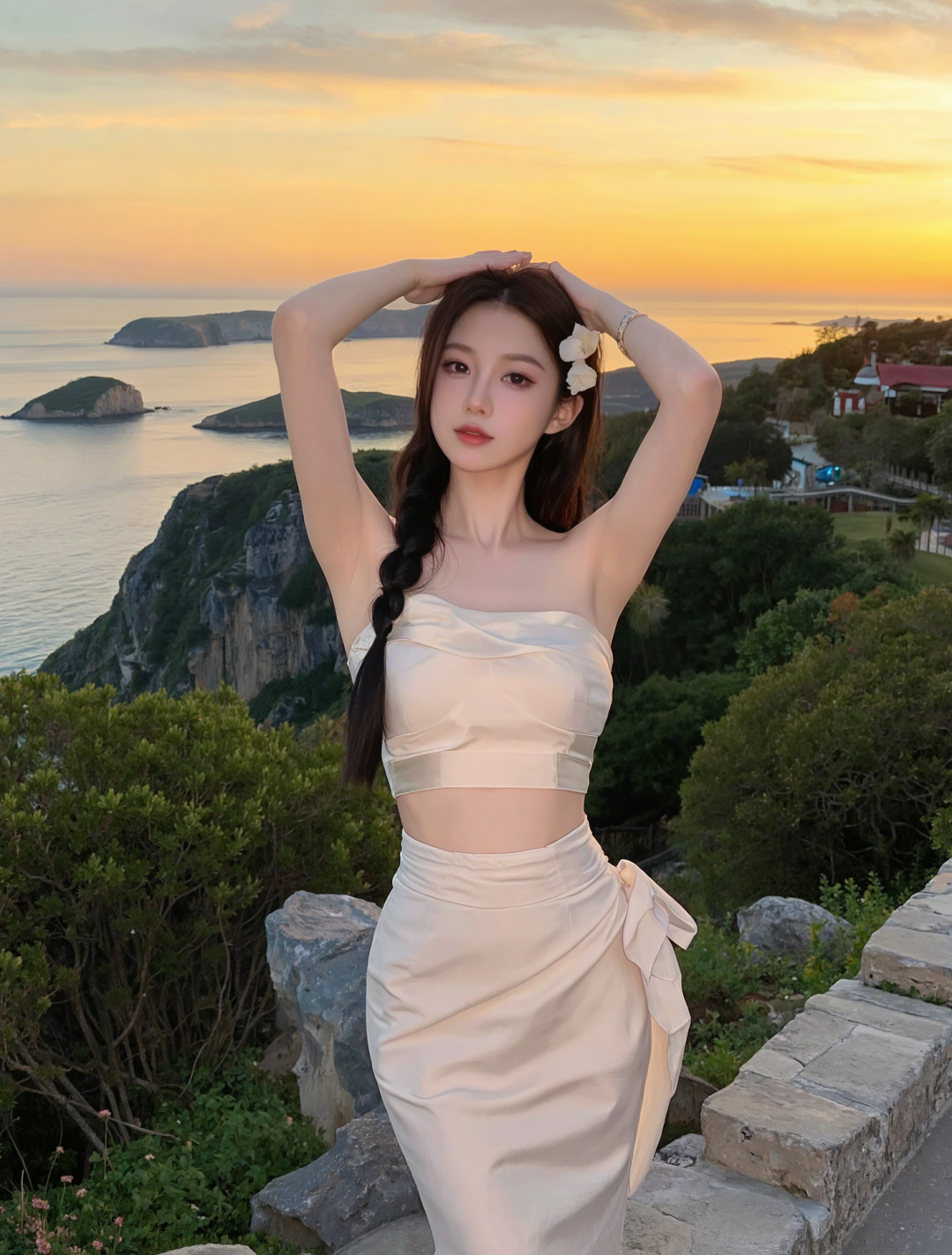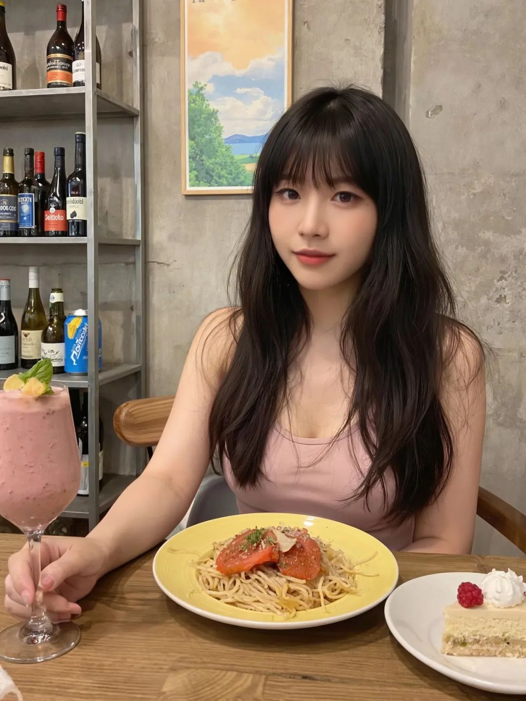 提示词:This is a high-resolution photograph of a young East Asian woman standing outdoors in a lush, green forest. She has long, straight, jet-black hair that falls past her shoulders. Her skin is fair and smooth, with a natural, even complexion. She is wearing a form-fitting, sleeveless, ribbed pink dress that accentuates her slender, petite figure and small breasts. The dress has thin spaghetti straps and hugs her body, highlighting her curves.The woman’s facial features are delicate, with high cheekbones, a small nose, and full lips painted with a bold red lipstick. She has a neutral expression, looking directly at the camera with a slight, enigmatic smile. Her eyes are large and dark, adding to her striking appearance.The background consists of tall, slender trees with green leaves, creating a natural, serene atmosphere. Sunlight filters through the leaves, casting dappled shadows on the ground and her dress. The sky is a clear, vibrant blue with a few white clouds, suggesting a sunny day. The overall mood of the image is tranquil and slightly intimate, capturing the essence of a serene, natural environment.