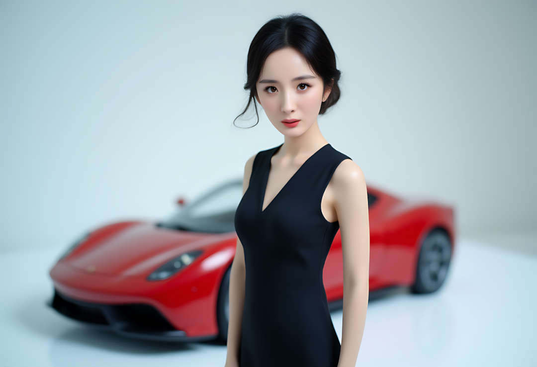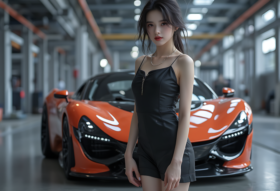 This is a high-resolution portrait of a modern style, featuring a young woman., In this dynamic display scene, a model stands in front of a beautifully designed high-end sports car with a posture that is both elegant and powerful, perfectly complementing the vehicle she is showcasing. The sports car catches everyone’s eye with its streamlined design and dazzling body colors, while the model adds life to the moment with her charm and confidence. The car model wears a simple and fashionable dress that shows her professional image without losing her feminine beauty. Her clothing echoes the colors and designs of the sports car, creating a harmonious yet engaging visual effect. Her hair, gently combed and falling over her shoulders, set off against her delicate makeup, showing her elegance and sophistication. Her eyes are firm and confident, as if telling the story behind the sports car and the speed and passion it represents. She leaned gently in front of the car, one hand touching the front, the other hand drooping. This pose not only shows her familiarity and closeness to the car, but also her professionalism and pursuit of perfect presentation.