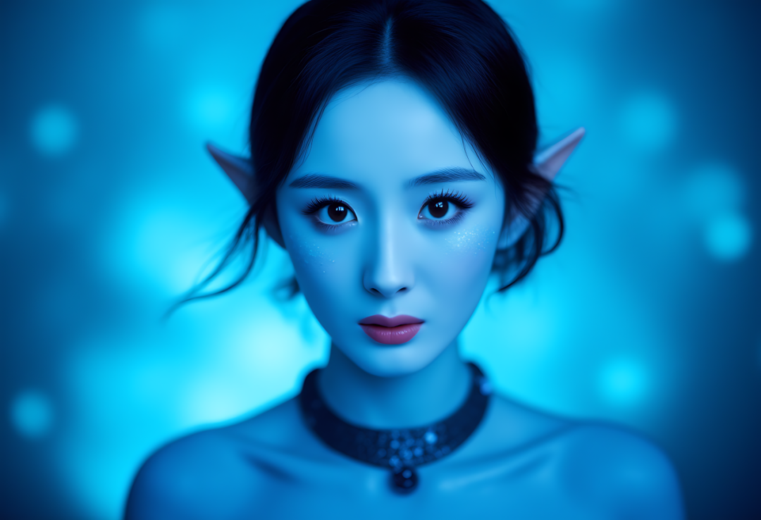 Photography, photo, realistic,Chinese girl,20-old-years, Craft an image inspired by the characters from the movie ‘Avatar,’ featuring a subject with the distinct blue complexion of the Na’vi. Their skin is detailed with intricate, bioluminescent patterns that glow against the dark backdrop, mirroring the mystical flora of Pandora. The character’s pointed ears, a hallmark of the Na’vi, protrude elegantly, and they wear a necklace with beads that seem to absorb the surrounding light. The makeup is designed to resemble the iridescent qualities of the Na’vi, with blue glitter and sparkles enhancing the facial features. The background remains intentionally out of focus, drawing all attention to the subject’s vibrant and fantasy-inspired appearance, as if they are a real inhabitant of the alien world depicted in the film.