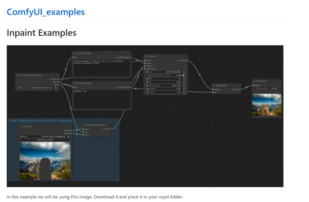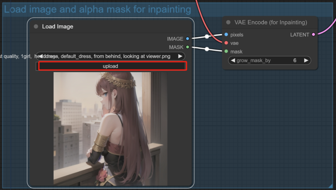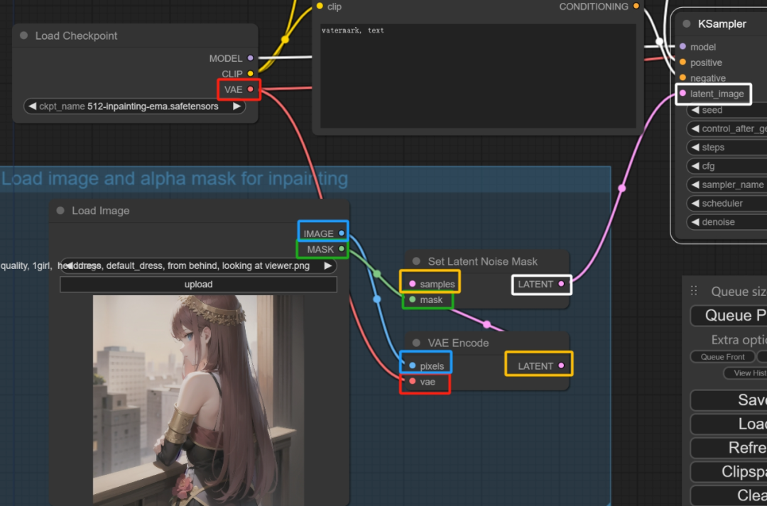 在这个节点旁边还有一个VAE Encode编码器,不过是for inpainting也就是为了重绘服务的。而这个VAE里面的mask端口可以理解为只对蒙版区域做编码,从而控制只在蒙版里做重绘。
