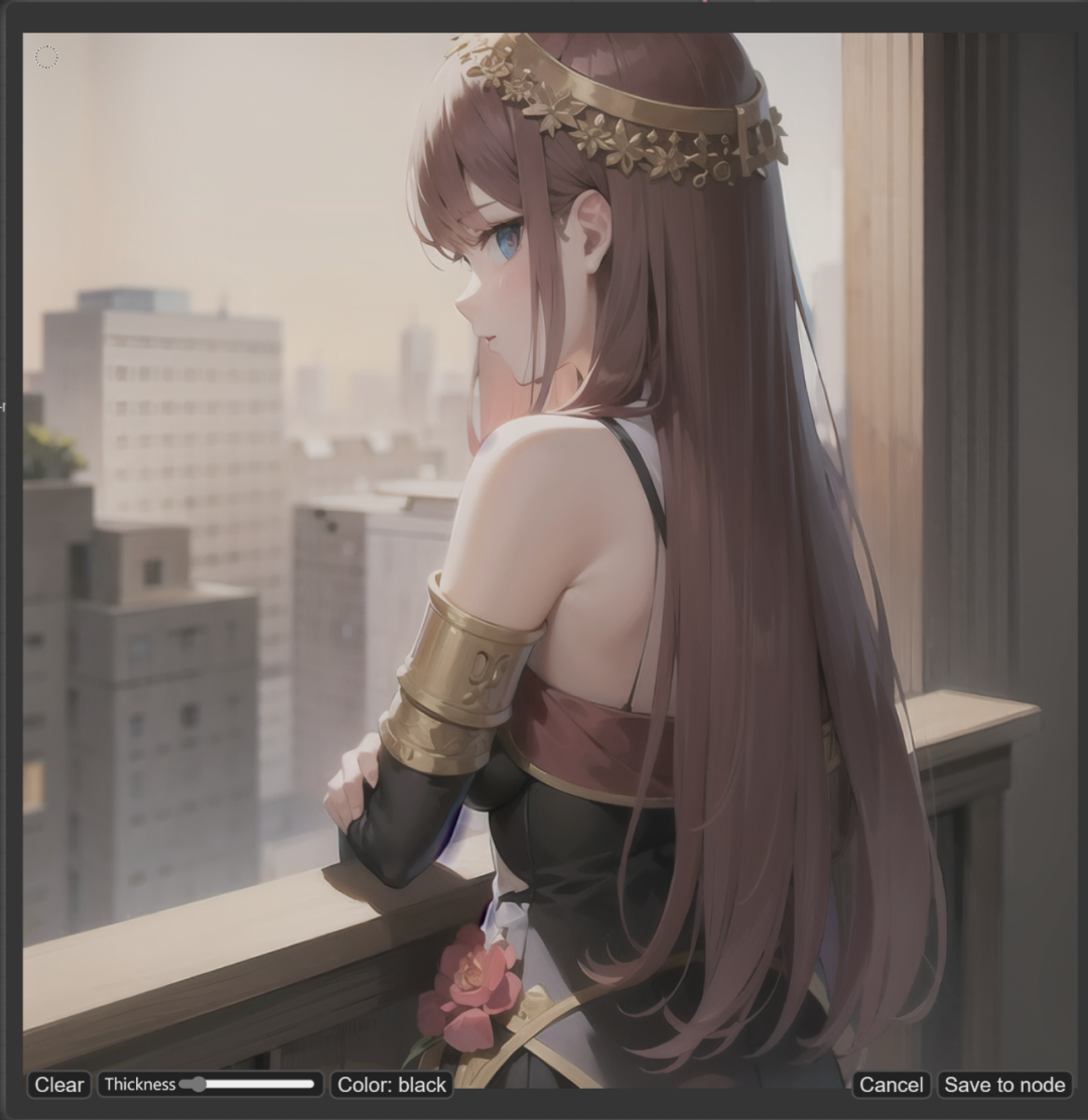 绘制操作和WebUI大同小异:clear是清除画笔痕迹、Thickness是控制画笔大小、Color是控制蒙版区域的颜色、以及画好后记得保存的Save to node选项。