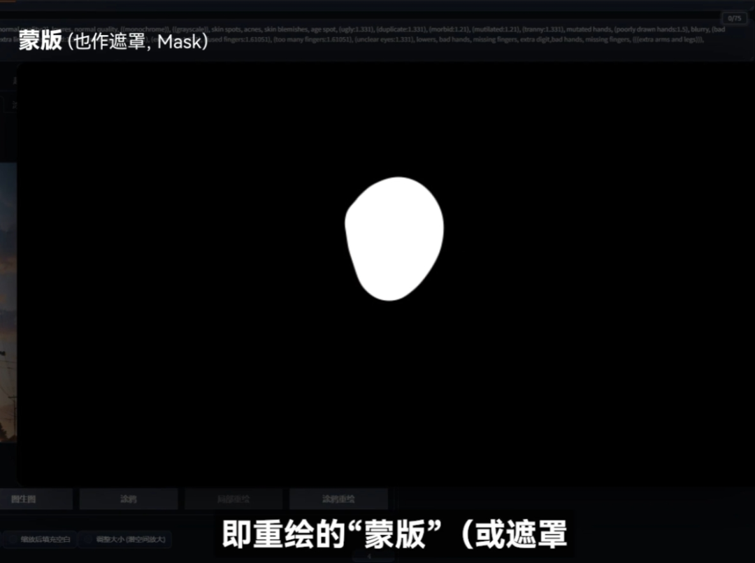 在WebUI中通常选择用涂抹重绘区域的方式来让AI知道要重绘哪里,这个被涂抹的区域会被AI识别为黑白区域,白色的部分也就是所谓的重绘蒙版“遮罩”。