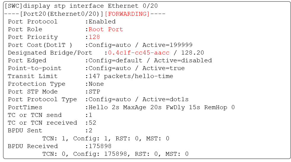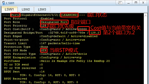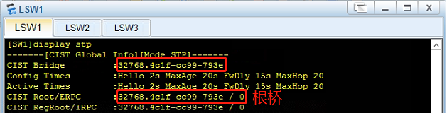 • SW1的Bridge ID=根桥的Bridge ID,说明SW1是默认的根桥。