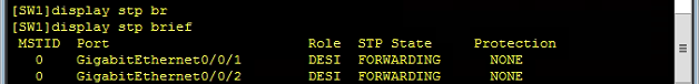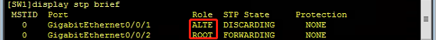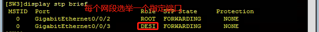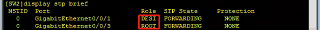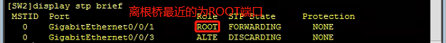 • 可以看到,SW2中离根桥近的g0/0/3变成了根端口,g0/0/1被选举为指定端口。