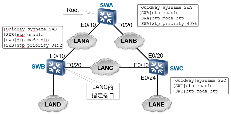 • 背景:让SW3作为根桥,让SW2作为备份根桥。