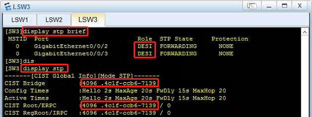 • Bridge ID=根桥的Bridge ID,证明SW3已经变成了根桥;从两个端都是指定端口,也可以看出SW3是根桥。