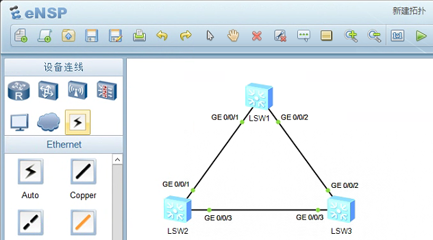 • 在交换机拖出3台S5700,然后选择设备连线,点击Copper进行设备接线,完成后开启设备。