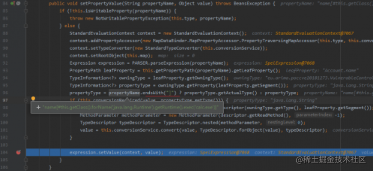 当用户使用[]嵌套属性语法,程序将[]中SPEL表达式解析并得到属性(特性),于是攻击者可注入恶意SpEL表达式以执行任意命令。