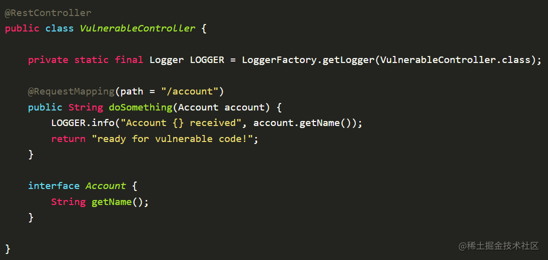 在实战中需要Fuzz字段,找寻自动属性字段。实验中Controller代码Account.name 已使用Spring默认构造器属性String getName()。故选取name为注入参数。