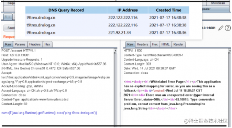 尝试使用DNSLOG 验证执行成功,故POC 调整为,如burp图中所示。