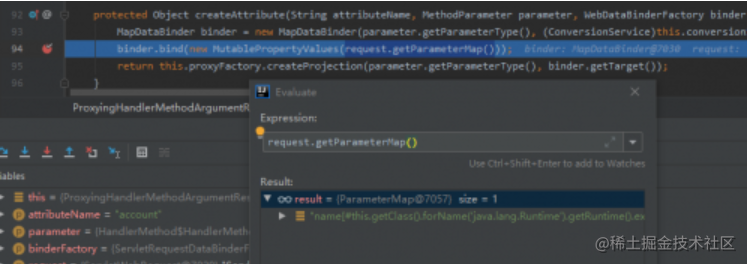寻找漏洞代码段,定位到spring-data-commons-1.13.10.RELEASE.jar!org.springframework.data.web.ProxyingHandlerMethodArgumentResolver.class#createAttribute(),程序错误将用户输入传递至MapDataBinder.bind方法。