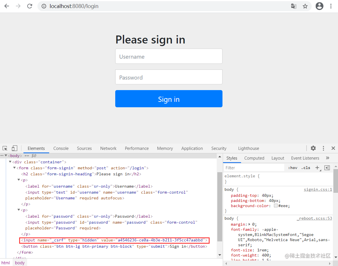 2.其实,如果我们使用默认的登录页面,可以在页面元素中看到同样有个隐藏域: