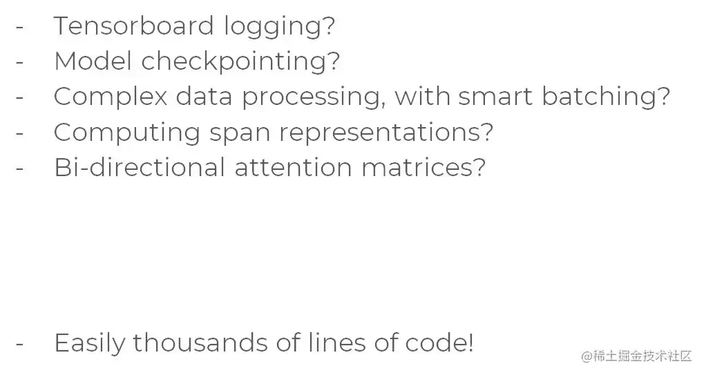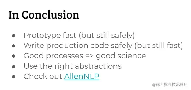 - 快速开发原型(要安全)* 写安全的产品代码(要快)* 好的流程有利于做出好的研究* 使用正确的抽象* 查看 AllenNLP(广告)这次分享的 slide 看了几遍,很多地方看得自己脸上发热,不写测试什么的说到了痛处。现在人工智能领域对于算法工程师的要求已经不是能掉个包,谈谈研究那么简单了,工程实践能力已经变得越来越重要。写优秀的代码,做优秀的研究,二者是一个互相促进的过程。