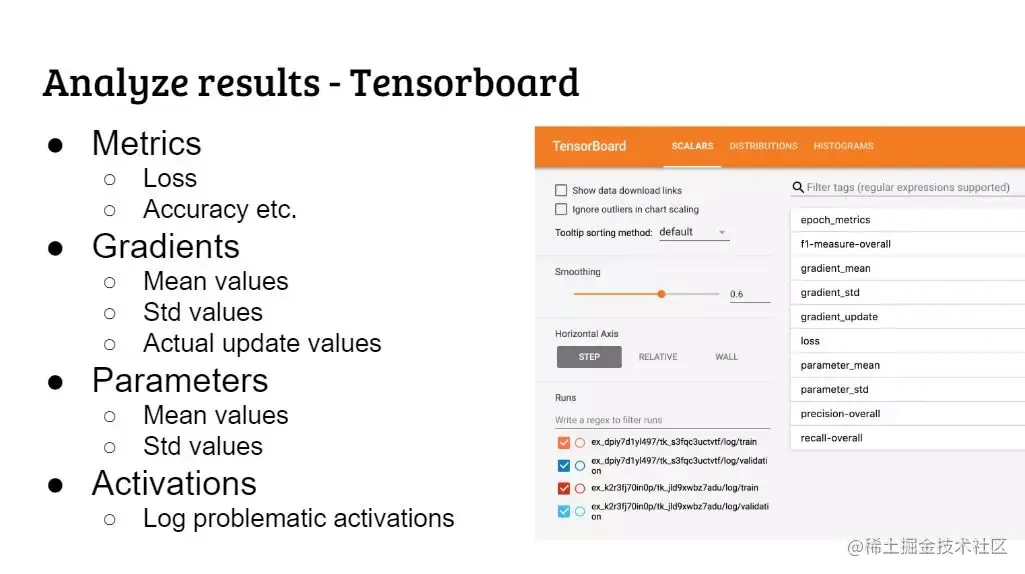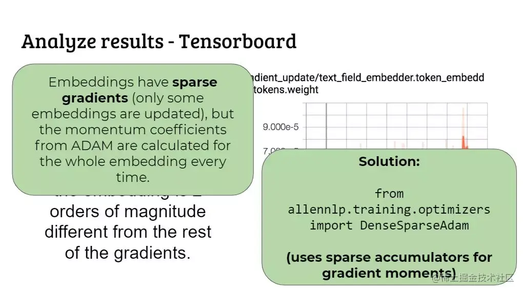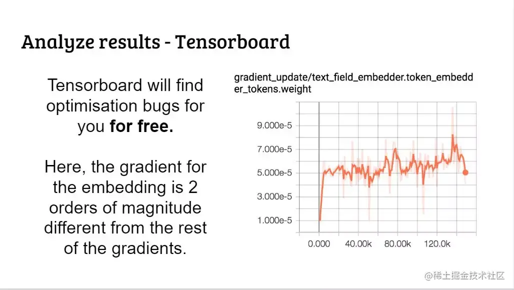 Tensorboard 能帮我们找到优化的 bug。比如上图中的 embedding 梯度有两个数量级的差别。