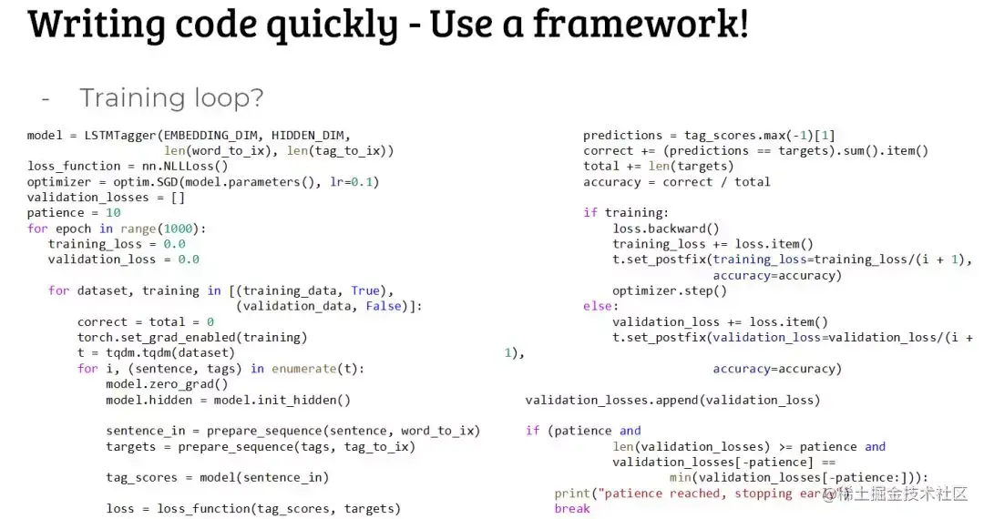 要做到快速编程,不要从头开始写所有内容,而是使用框架。这里的框架不仅指 tensorflow 或 pytorch 之类的框架,也可以理解为模板。比如上图中如果写 training loop 的部分,已经有人写好了。我们只要看懂后,直接拿来用就行,没有必要从头开始自己写所有部分。