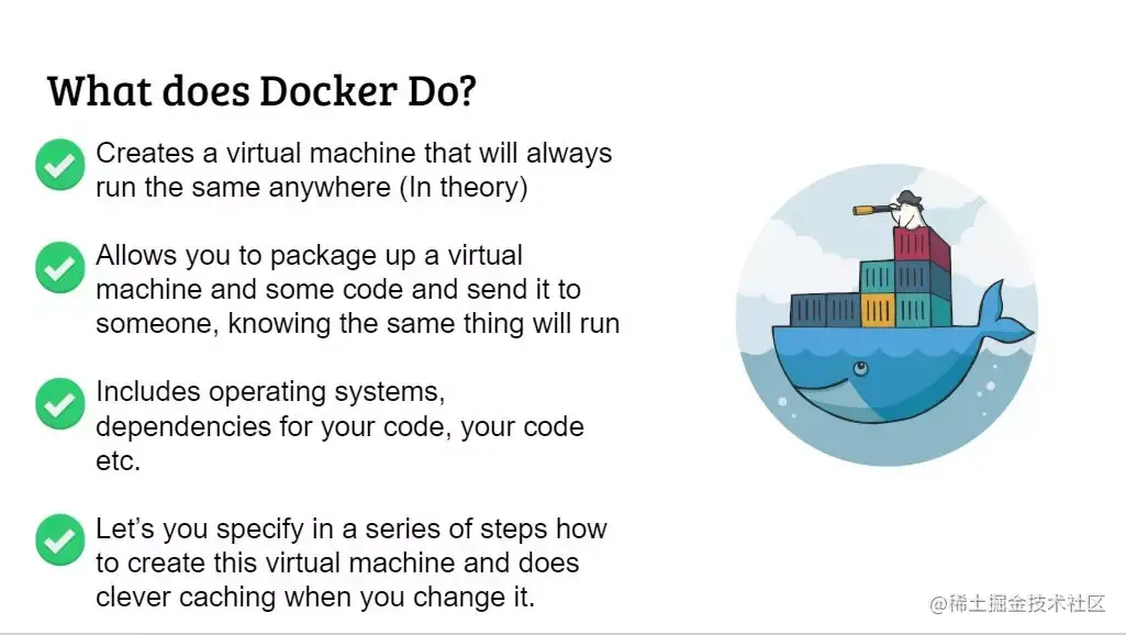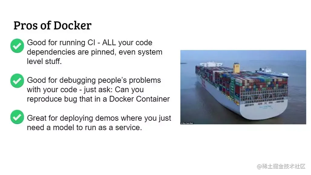 简化安装的流程,令代码运行在任何平台,使用隔离的环境。下面是使用 Docker 的一些优点。