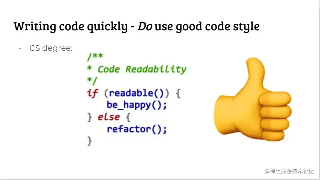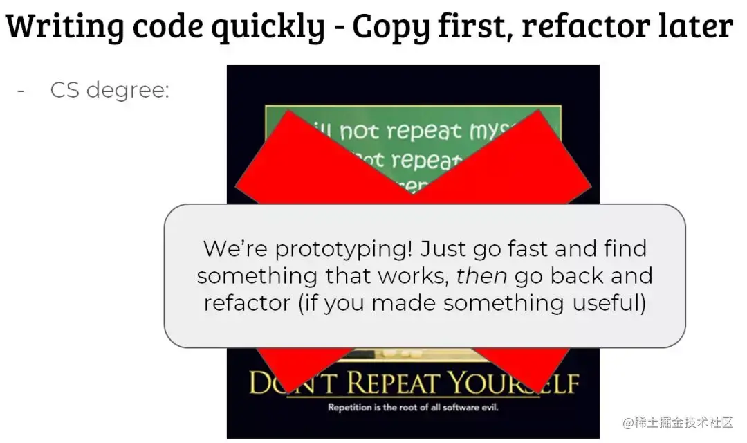 要想快速开发,另一个建议就是先复制,再重构。要记住,我们是在写原型,不用在乎什么可用性,先把代码写 work 了再说。如果实现的效果不错的话,再回去重构。