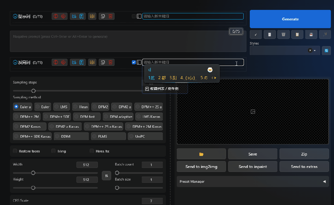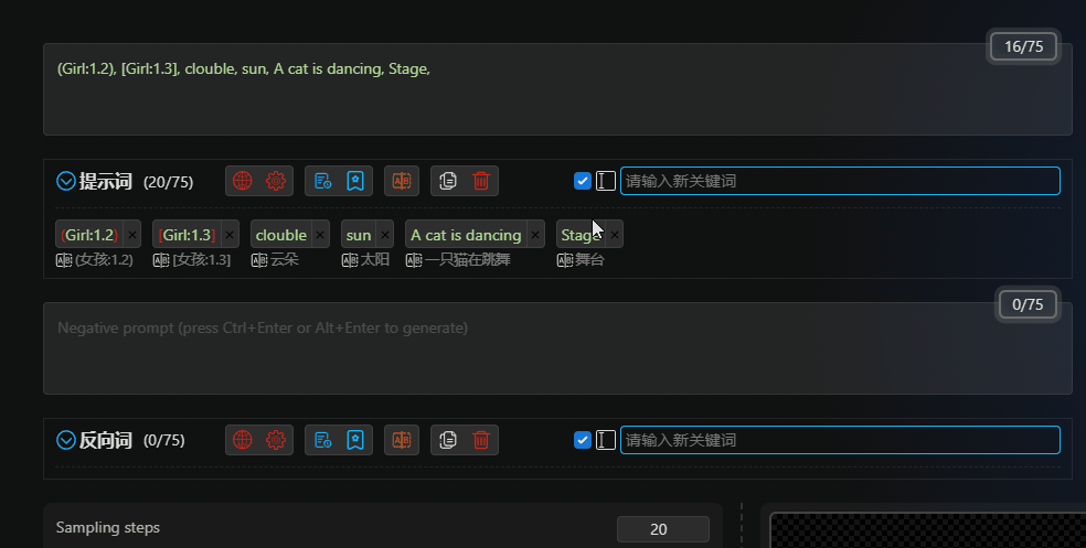 也可以直接在webui的输入框输入,点击一下空白处就能自动翻译了。加载lora也是这个方式,就是点一下lora,点一下空白处,就自动做逗号分隔了。