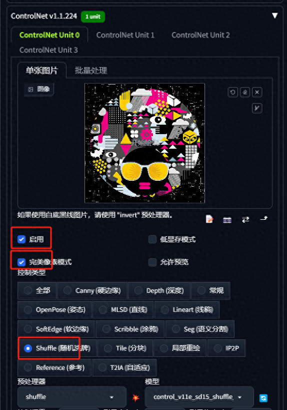 找到ControlNet,勾选启用、完美像素,Shuffle(随机洗牌),从网上找到一张比较有特色的图片扔给ControlNet。