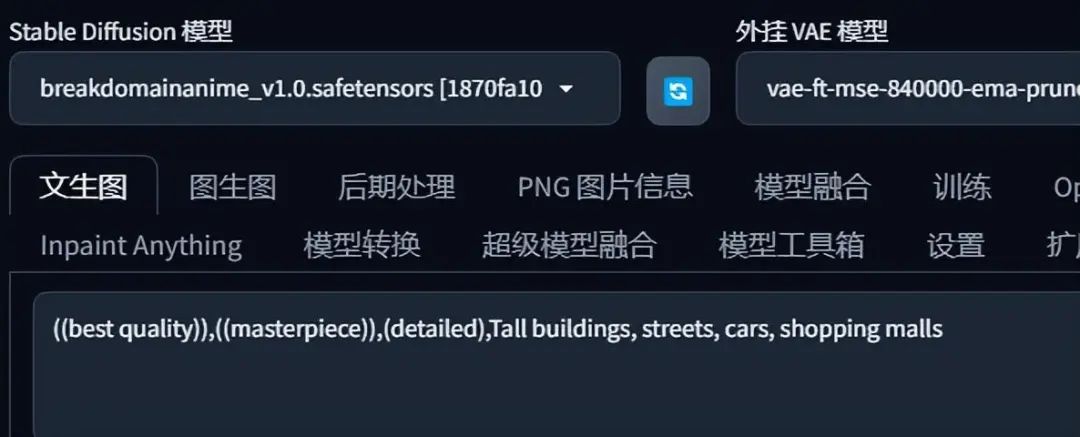 大模型选择二维模型,提示词除了几个质量起手词外,其他的提示词为“Tall buildings, streets, cars, shopping malls”意思是“高楼、街道、汽车、商场”