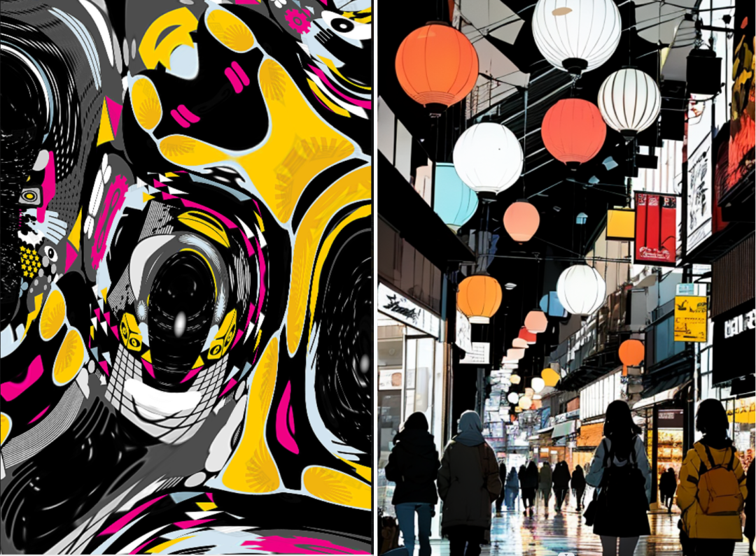 下图中,左边是SD将参考图打乱后的图片,右边是保留了原图元素之后生成的图片,它将原图中所有的颜色、线条的风格等元素全部沿用到了新生成的图片中(右图),对于做一些主体海报的延伸物料的时候比较有用。