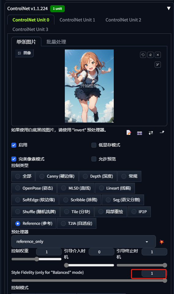 Reference(参考)的设置基本保持默认,勾选”完美像素“,建议把权重值调到1(下图红框内),这样生成的图片能更接近参考图。