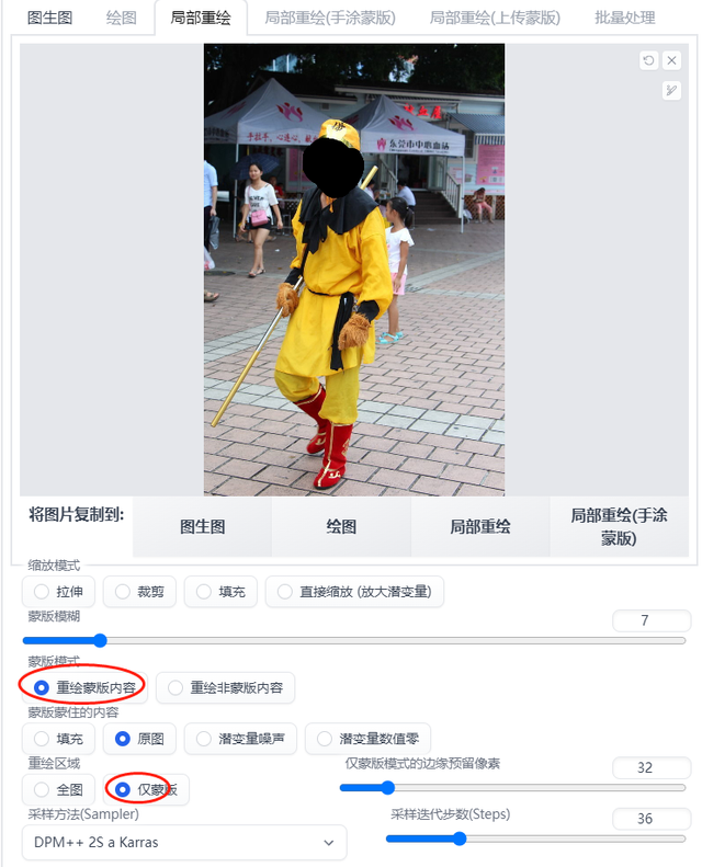 我们希望只替换猴子的脸部,其他部分不变,所以要用画笔将猴脸部分涂抹掉,然后在下面选择“重绘蒙板”内容和“仅蒙板”,至此局部重绘设置完毕。