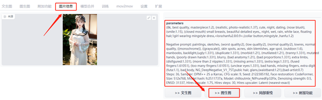 想要让猴子变美女,那美女的关键词 tag 肯定少不了,老规矩,找来一张带关键词的美女图片,将它拖进 stable diffusion 工作台的图片信息里,它的关键词就出来了,然后点击右下方的图生图功能,我们要利用这些关键词生成一张美女的脸。