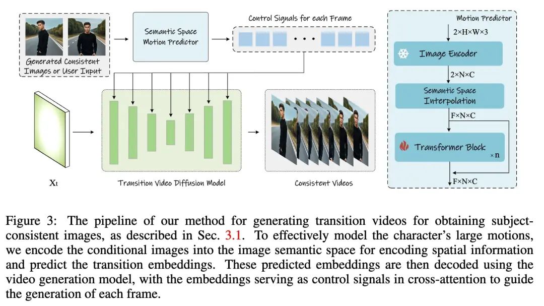 运动预测器的结构。下图展示了,StoryDiffusion 方法用于生成主题一致图像的过渡视频的流程。为了有效地模拟角色的大动作,研究团队将条件图像编码到图像语义空间中以编码空间信息,并预测过渡嵌入。然后,使用视频生成模型对这些预测的嵌入进行解码,嵌入作为交叉注意力中的控制信号,指导每一帧的生成。这些图像作为插图,用于叙述如上述所示的复杂故事。
